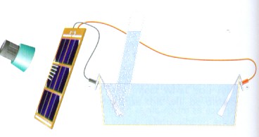 Process: First, I filled the bowl with water and mixed it with a tablespoon of salt. Next I cut two strips of aluminum foil and folded them in half, leaving the tops open slightly. Placing the ends of the strips in the bowl, I attached the solar panel wires to the ends of the aluminum strips. With the system hooked up, I turned on the lamp. Next I dipped the test tube under the water and slowly drew it out, keeping the opening pointing down into the water so that it remained full. Moving the test tube over to the strips I held it there and caught the gas bubbles. Once the tube was full of gas, I moved it over and held the tube over the lit candle opening downward.